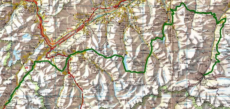 The good news is that Kev Reynolds has written a guide (not that I did it quite his way) & you can do the whole tour on Swiss maps. You need LK282 (Martigny), LK283 (Arolla), a bit of LK 273 (Montana) & LK274 (Visp), LK284 Mischabel or the Zermatt assemblage map. These are all LK50 (1:50,000). Using LK25s means carrying a lot more maps & some of the paths are actually better marked on the LK50s (in 2004).