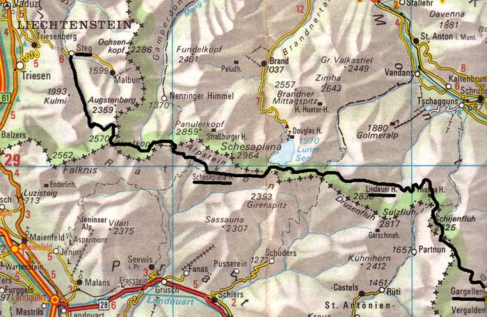 Alternative Start from Gargellen to Vaduz (Rhätikon trip)This is a great way to start the Cross-Swiss Walk, although for the first three days, one is in and out of both countries and Liechtenstein. This map is copied from the Official Map of the Automobil-Club der Schweiz, (with their permission) which is on this link but not to scale |