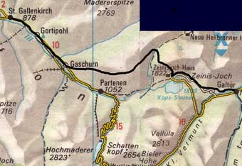 This map is copied from the Official Map of the Automobil-Club der Schweiz, Saturday 5th September 2009 Not a cloud in the sky when I woke up but, & it's a big one, the snow line from yesterday & presumably, last night, was impressively low: about 1800m & a plan B was necessary. Good buffet & refused a fried egg but the total bill was €45.10. Incredibly low. Although it is partly jeep track, I went up the delightful way to the Zeinisjoch, only 1000' above Galtur & some way before the hotel & Kops Stausee. It is the border between the Tyrol & Vorarlberg & also the marked watershed between the Rhine & Danube. |