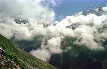 Cloud was floating about. I bought some supplies in the Co-op and caught the bus (South Effricans and a Korean) to Stechelberg 910m to walk up to Ober Steinberg 1774m. The first part to Trachsellauenen was more uppish than I had thought. The Breithorn and the Grosshorn occasionally came out of the clouds. Going up the Ammerten Cliff path was bit like the Undercliff at Lyme Regis but a lot longer. It was still cloudy when I got to Ober Steinberg, so I had a beer and turned north up the path across the Tschingelgrat to the point where it crossed over into the Sefinental. The hills came out occasionally, making it all worth while. A track was marked up to the 'Tanzbödli' (dance floor) and I took it. Steep and nasty, it came out on a flat bit of ridge below the first crag (c2100m). I had a good view of the Jungfrau. The path down was nasty mud at first, then steep gravel down for ever to the brook at 1250m. |