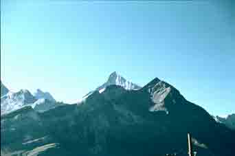 A stiff walk - the Mettelhorn 3406mAbout the same height as the OberRothorn, you have to walk the whole height, 1800m up from the village but it is straight-forward & this is the best viewpoint in the area, better than the Matterhorn! There is no longer a signpost to the Trift Gorge in the village on the East side of the high street. It starts next to Grampi's Pub see photo right, but it is not too obvious, so reconnoitre the evening before. Start as early as you can. The path goes steeply up past the Alte Post Hotel to Alterhaupt, Café Edelweiss which may not be operating. This is the true beginning of the Trift Gorge, which is not so steep. Carry on up it to the Trift Hotel, which also may be shut & bear right into the Trift Kumme. This is usually floweriferous. At the end, the path bears right & turns left onto a snowfield, which you cross obviously to the Mettelhorn summit cone. There is a messy zig-zag path to the top. I did it with my 66 year old Father in 5hrs 50mins in 1982. You have to go back the same way but the views are splendid. |