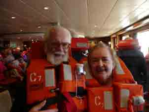We got a courtesy bus straight away from the station & had a snack at the Cruise Terminal. This was a mistake, note. It is smarter to get one's boarding card first & snack after, as the loading on was tedious & we were nos. 129 & 130. But we already had been given our bus passes & been photoed at check-in, which is an improvement. Imee, a colleague from last Summer's trip, was on duty & we greeted each other. We dumped our stuff in the cabin, Ken went to the Cruise Office with his letter for the Director, offering his lectures if anything went wrong, we greeted our cabin steward, then tea. Our luggage came, first, the rucksack, then a bag but until after dinner (thankfully, we are first sitting), no bag. Ken asked at Reception & some bags had had their labels torn off. This was Avis', so she was quite anxious & had half unpacked before the floor show. The lifeboat drill was a lot more thorough than previous Fred's trips, with us going out to the boat in a Conga, this doubtless thanks to the Costa Concordia. |