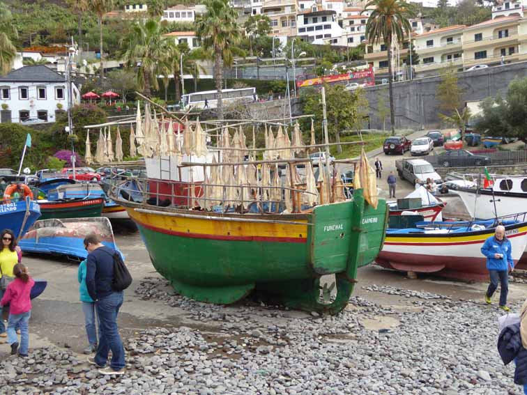 Then, we went down to a little fishing port, Câmara de Lobos, their selling point being that Winston Churchill painted there. So what? It is a cute village but lots of the fishing boats were drawn up & the fishermen hanging about. One was slapping resin & fibreglass on his upturned dinghy. I walked up steep alleys to the top of the town but, lacking a map, did not know how to get to the newer church, the old one being very old & was running out of time.