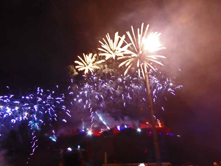 Dinner was early at 17:45 in the self-service & at last, I had the opportunity to get a decent number of vegetables down my neck. However, the time set to take us into town was set ridiculously early. We were in to the drop-off point at Charlotte Square West by 19:30 or so. We had wrist-bands to show we were eligible to go into the fenced-off area & walked up Princes Street but found, to our disgust, that the plentiful benches all along the railings had been fenced off to, we were told, protect the wiring of the many screens with loud, low-quality pop-type music from, presumably, terrorist attack or some such similar notion. We walked up The Mound to an Italian café for hot chocolates & a chat to a Catalan mother & daughter, which gave us a sit-down for a while, then went onto the Royal Mile but it had a cold wind ripping down it.