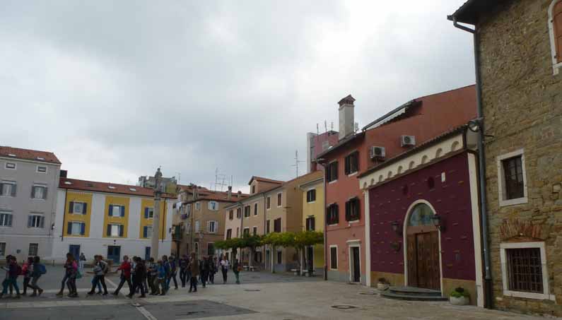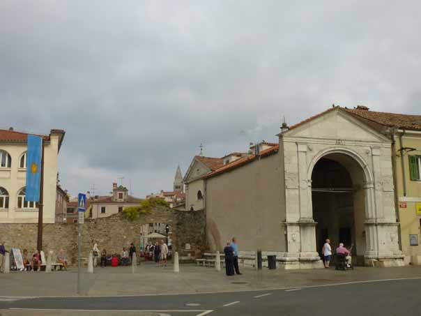 Where, you might ask but it is just South of Trieste. The ship berthed very close to the Old City & we walked in, with a climb up steps to the Belvedere, part of the old fortifications. It used to be an island but land has been reclaimed round all sides except the North, where the ship berthed. There are lots of pictures below, as this is probably an unfamiliar place to most people & the photo to the right is from the top deck of the ship, showing just how close the port is to the city centre. We were soon in Tito Square, which has the Town Hall & Cathedral, very pretty. |