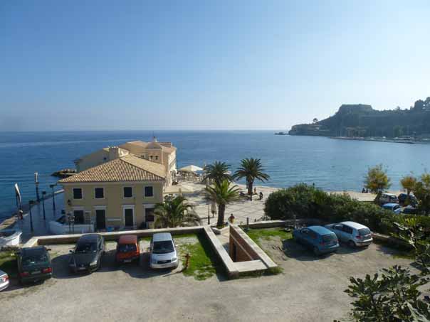 This brought us out on the big green, the Spianada Square, on the North side, where we stopped for coffee €6.60 & I gave an Albanian girl beggar with a baby a euro as well. We could see Albania clearly across the sound. St. Spiridon Church did not allow photography. Meanies.