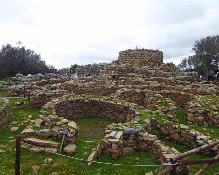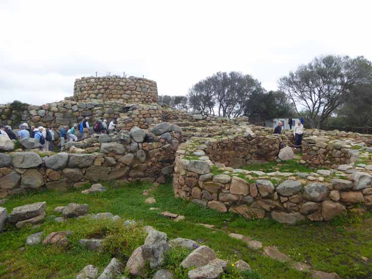 Up earlier and a coach tour on another dull day, to a prehistoric village at Arzachena, with a tower curiously resembling a broch but much earlier Ken thinks, 1,800 - 1,600BC. Below left is a picture from the official brochure of the site. |