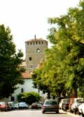 We left after 1000 & drove on a route I had carefully written up for Avis' navigation, as it looked tricky. Back through Condom & on the road to Lectoure (in French). It was a pity we did not think we had time (we did) to stop in Lectoure, as it is a fortified medieval town on a good position on a rock, with much extant wall. We carried on, being impressed by another town, Tournecoupe, but disappointed by St Clar. We went on another road to Verdun (in French), which cut off a corner I had not noticed but was signposted, the signs being quite good out here after our bad time in Bayonne. Verdun is a 'proper' working town but the bastide middle is very well preserved & we liked it a lot. (Link to our scrapbook page for Verdun). The town hall was just closing & the library would not be open for two hours but I think I will write to them if their stuff is not on the Internet. We walked round under the wall back to the main square, where we had coffees €4.20 & left, going over the narrow suspension bridge over the Garonne. Just before, there was a splendid view back, which I photoed. The road to Montauban (in French) was straighforward & free motorway at the end. We parked just outside the pay zone & wandered into the town. We found the wonderful square (Place Royale, now Nationale) where the market had been this morning (it was now after 1300) & had paninis for lunch there, rather large ones. This was under the double arch that surrounds the square, which looks very old & built, like much of the town, of brick from, it appears 1651 after a fire. We needed to see this place, as it was one of the last Protestant strongholds in France.