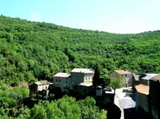 Müsli was available at breakfast & rather odd croissants with little butter content. We wandered off in the car up into the Black Mountain towards Arfons, the trees being a very attractive feature of the whole trip today. Then off to La Galaube, which turned out to have big dam & to St Denis, on the South fringes. There were two roads to Cuxac Cabardès & we took the D62, which had a good view towards the Pyrenees. We went up the main road for a bit & turned off to La Tourette, bizarrely placed in a steep sided valley, where I took several photos. Also at the larger Mas-Cabardès further down, which had strange rock formations. We soon turned left through Roquefère to LaBastide Esparbairenque, into which having driven, I had some trouble backing out! This did not look like what one understood by a bastide, being unwalled & on a steep hillside like many of the villages round here. We carried on to near the top of the mountain to join D112, which drops through the Gorge de l'Arnette, which had a series of derelict industrial buildings in the bed of the gorge, perhaps once water-powered. There was wool in evidence industrially but, despite a warning notice about sheep on the road, no visible sheep. We were soon in Mazamet, which I incorrectly remembered as grotty & had omelettes & coffee for lunch for E20.50 with tip, there being no sources of coffee on this morning's route. Then, we came back to Sorèze via Dourgne, easy driving for a change. We tried & failed to find the little supermarket.