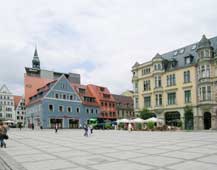 The now ubiquitous Ryanair have a destination called "Leipzig, Altenburg". This is neither but goes to an old Soviet airbase with grass coming up through the runway at a village called Nobitz outside Altenburg. It' not even really at Nobitz, as the road comes out weither at Altmörbitz (badly signposted) or The flight was on time but, at Altenburg, while our luggage came off instantly, the passport queue was very slow & packed into a tiny space. The hire car girl was slow, too. I muttered "DDR dienst" to the couple behind us, who laughed. We had coffee & Avis, an ice cream, in the airport café (E8.40). Newly invented German word, "pott", meaning a mug of coffee. Then, I eventually discovered our car, a metallic blue Fiat Panda & doddled down very good, if narrow, roads to Zwickau. There were diversions for road up. One, the information girl warned us about but the other, we ran into. The map off the Internet of Zwickau crucially did not show the Dr. Friedrich's Ring, so we went round twice before finding the 1A Aparthotel, which is in an antique road, the Robert Müller Strasse & rather nice, with a proper German landlady, Frau Kramer but no lift & it was a struggle to get up.
