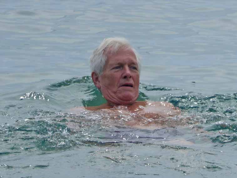 Then, Martin went in for his swim, passing a nice lady to whom I said that at 80, he was still chatting up the birds. She seemed to be a trophy wife on their first day & I gave them some tips. Meanwhile, Martin was quietly freezing in the sea & on coming out, took hours to warm up again. Maryse had been very anti his going in at all, worrying about taking him home in a box. |