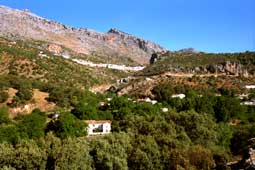 I though we were going up a pass but there was a plateau on top with Ronda at 750 metres in the middle of it or so it appeared. We drove through the town with difficulty but had no trouble finding the road off to Benaojan and, although the Hotel Molina del Santo is well concealed near the railway station and we had no local map, it proved easy to find. We were in this hotel, as it was run by a couple of English Greens, who use local produce and labour as far as possible. There is a set of villas with patios and ours (no 9) was particularly good, as it was shaded in the afternoon. I went in for a swim and taught the English son of the proprietors neighbours to dive. Cheeky monkey, he nicknamed me Father Christmas. We found that half board included tea and cake from 1600 - 1900. The mill-stream (Molino) runs by the side of the hotel site. The dinner was good as well. I had swordfish and Avis, hake.