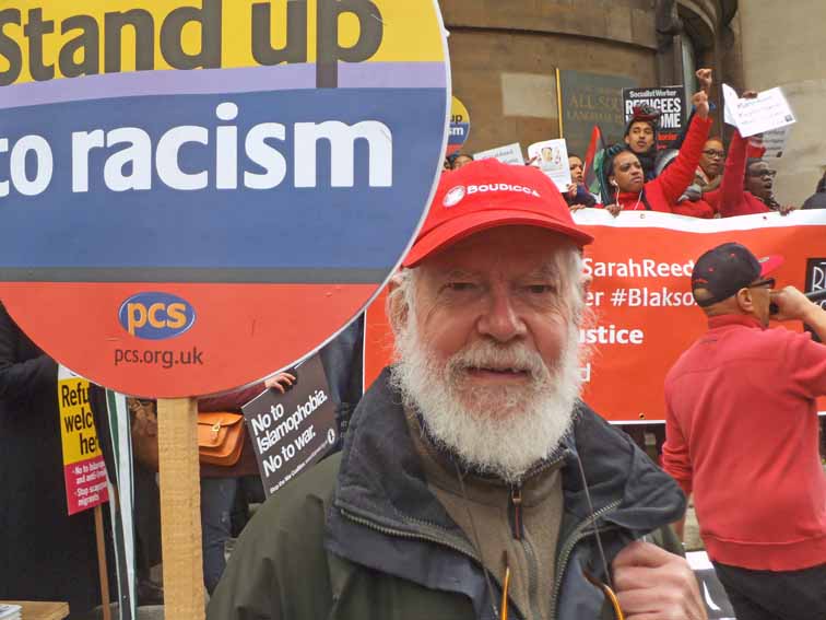 Sarah Reed died in still unexplained circumstances in Holloway Prison on remand for attacking a social worker who was trying to rape her. Being on the mailing list of BlackoutLdn (Kayza Rose's charity) Ken went to the two vigils (left & centre below) at the prison. He keeps in touch & at the big demo outside the BBC on March 3rd, we had a banner (right). Doris Hollander was there, too.