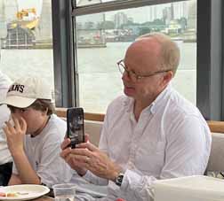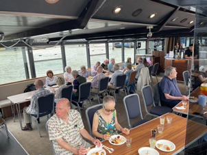 People drifted in with the family first except Justin, who was still in plenty of time. We were allowed to let them board early, as it was rather cool at first. As usual, I introduced everyone on the Tannoy. A surprise was Robin King, the Architect. I think this is the list: Zoi Economu & Raphael Economu; Mara Baldry; Liz & Paolo Rizzi; Justin, Nanako;, Yousuke & Kaisei Dowding; Avis’ famous son, Jason Watkins & his son Gilbert. That is the family. Philip Carver, faithful attendee at Ken’s European History class & the next-door-neighbour from Heaven; Lady Catherine Osborn, from the U3A & Richard, the oldest couple on the boat at 88 & 90; Viv Duckett & Peter Hunter from the Claremont Project; Peter Prince, the Singer from Caffé Nero; Martin Klute's Jazz Band & he is also one of our local Councillors; Hazel, our Cleaning Lady & her sister Sharon; Maria & Valeria, our Ukrainian sisters; Stephen & Ann Barry; Rene Peel; Stan Rosental; Hilary Roodyn. all from the U3A; Penny Vickers & Nigel, Reuter contacts but Penny was also a BBC Singer; Michèle, Kens Best Friend & Alan Molloy, her husband; School friends Don & Dame Elizabeth Hoodless; Michael & Valerie Weathers; Melvin & Fiona Higgins.